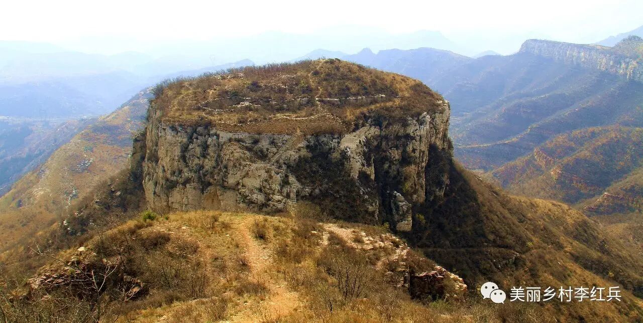 终于在这里看到了孙家寨的全貌。只见山坡的前方有一个圆柱形状的山,山顶的一侧是一个山门,四周是悬崖峭壁,具有一夫当关,万夫莫开的的气势。修寨的人既然选择在这里修建寨子,就是看中它的地势险要,远离尘世的原因。
