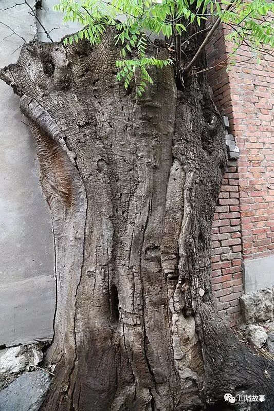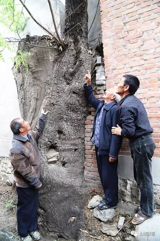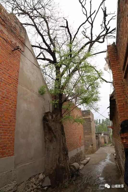 在时丰村,一说起他们的槐树王,大家都知道,他们坚信这棵大树是他们的祖先在明朝洪武年间大移民时,从洪洞县那棵大槐树下,挖了个小树苗带来时丰的。有多少年啦?几百年不止了吧。小编和村里的几位老者一起去查看,果然是一棵沧桑老树,一半在墙外,一半被一户人家砌到了墙里边,倔强的老树只好从旁边发出一支枝杈,绿绿的向上生长。