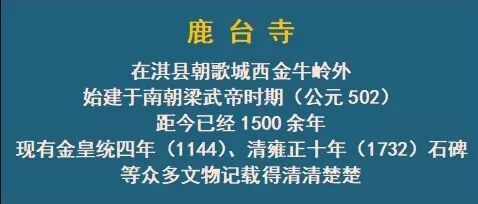 在淇县朝歌城西鹿台建立寺院(鹿台寺),成为佛家圣地,是从南朝梁武帝时期(公元502年左右)开始的,距今已经1500余年。