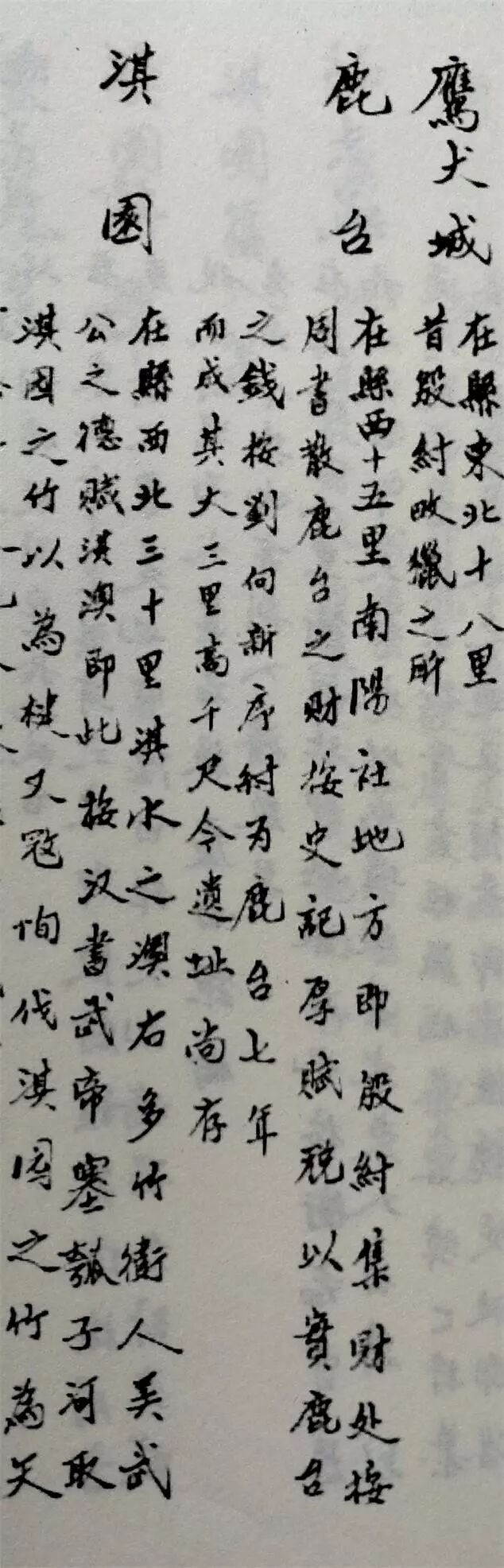 类似的还有清嘉庆《浚县志》载:“鹿台,在朝歌城,今淇县也。”明嘉靖、明万历、清康熙《浚县志》所记位置又有不同:“鹿台,在故卫县西二里”,这里又把鹿台的位置错记在卫贤西。