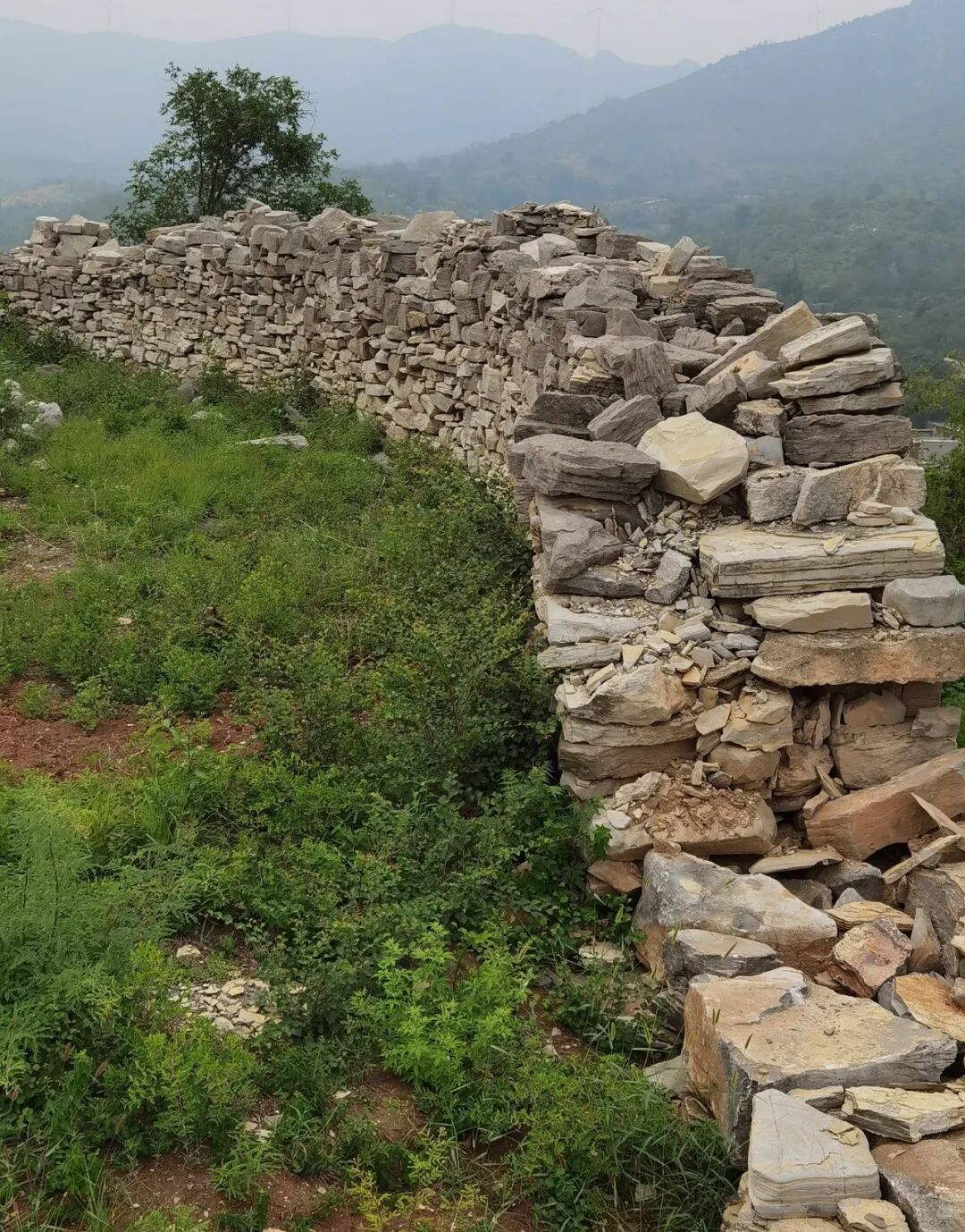 △麦穗墙一角 历史遗迹众多 柳林村有老爷庙和菩萨庙,这两座庙前均有古石碑。老爷庙前的古石碑上刻着“明朝万历三十二年重修玄武大帝金顶寺”字样。老爷庙当年为何叫金顶寺,村民们说,柳林村周边水系丰富,土地肥沃,桃、杏、梨、枣、李子等满山遍野 ,果树开花时满山繁花似锦,各路神仙下凡时常喜欢到柳林村的山顶上歇歇脚,“金顶”由此而来。菩萨庙前的古石碑上刻着“康熙五十二年重修观音堂记”“李子林”字样。“从老爷庙前的古石碑记载的文字来看,在明代就有我们村,而且当时村子人丁兴旺。”栗长安说。 老寨墙遗址是柳林村的“宝贝”,也是众多游客的“打卡地”。老寨墙遗址在柳林村西北山顶上,它随山就势呈椭圆形,寨墙为石头堆砌,宽约1.2米,高约2米,周长约150米,老寨墙遗址保存完好,垛口清晰可见。黄洞乡政府投入资金对老寨墙遗址进行了保护整修,并修建了上山步道,该处成为当地的一个旅游景点,吸引了不少游客。