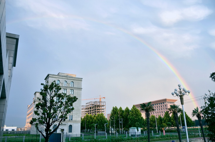 2014年7月14日,在河南省鹤壁市淇县丝丝的小雨中,一道美丽的彩虹呈现在该县城北新区的天际。当日傍晚18时50分左右,该县突降小雨,在丝丝小雨中,一道美丽的彩虹呈现在天边,犹如一座幸福之桥,连接着该县新城区和老城区。 (李闪闪 摄影)