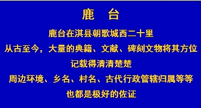 鹿台,在朝歌城西20里。对此,历史文献有大量的记载,还有碑刻、地名等文物佐证。
