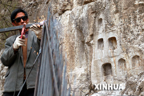 12月6日,一名工人为石窟安装护栏。河南鹤壁市五岩山东魏石窟保护工程主体工程日前完工,12月中旬即将对外开放。 据介绍,东魏石窟位于五岩山南麓的崖壁上。作为非皇家营建的民间石窟群,五岩山石窟体现了南北朝晚期民间石窟艺术造像风格,颇具代表性。 新华社发(李国庆 摄)
