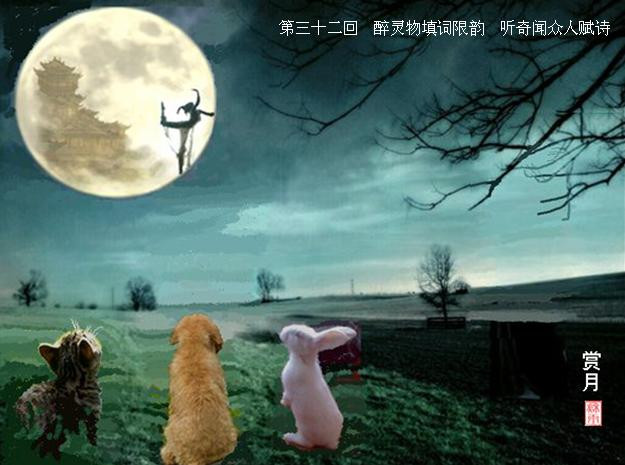 一轮圆月高挂中天,狗狗、猫猫和兔兔哥哥赏着明月,议论不休,玉兔妹妹独自躲在一边。狗狗突然说道:“记得他们在芦雪庵即景争联诗句,今天我们也应该学学他们,学学风雅,将来上到球球上,好与他们结个诗社,好与他们赛诗。”