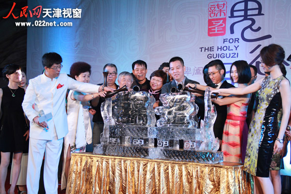 众人一起为《谋圣鬼谷子》冰雕注墨