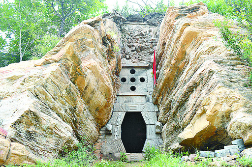 “大壶天”洞窟口两侧分别镶青龙、白虎头雕像。虽然已经被损坏,但依稀还能辨认出大致的轮廓。门楣石题“大壶天”三字,两侧刻有“乾隆五年建,先天八卦”题记。门楣上是五个成十字形排列的圆形洞口,村干部杨希文和康长海告诉记者,这是五个窗户。村里人称其为“左青龙,右白虎,七星八卦,五窗户”。